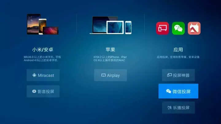 首先,在电视端“我的应用”中找到“无线投屏”,选择“微信投屏”。