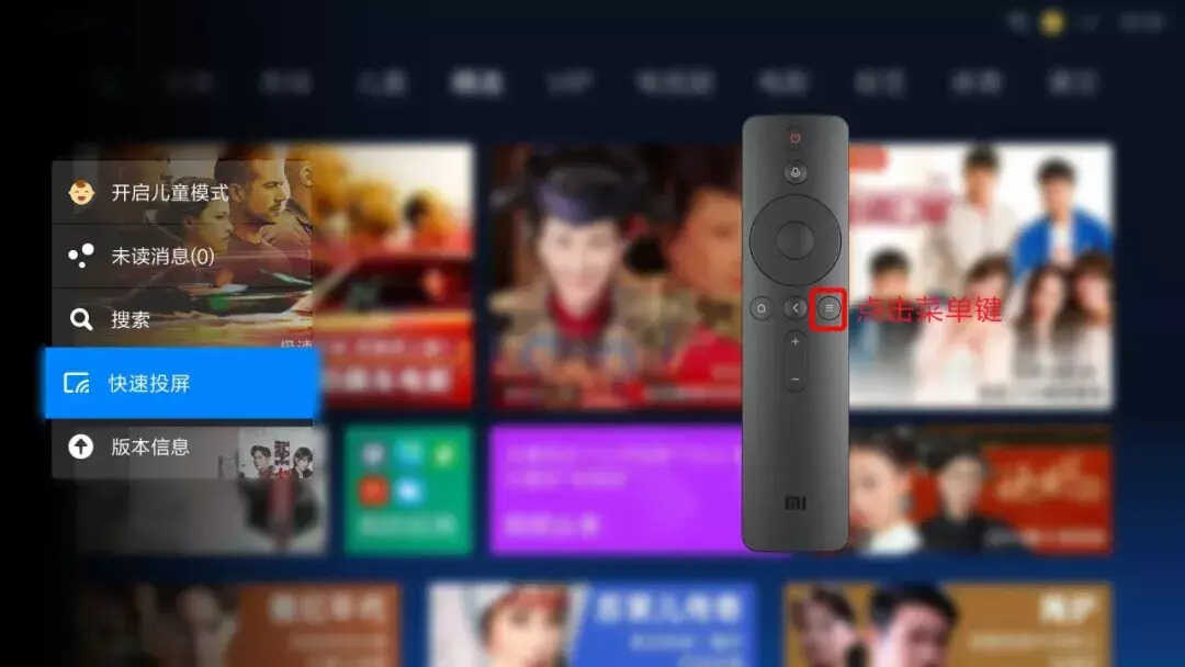 第一步:打开小米电视,首页点击遥控器菜单键,找到快速投屏。
