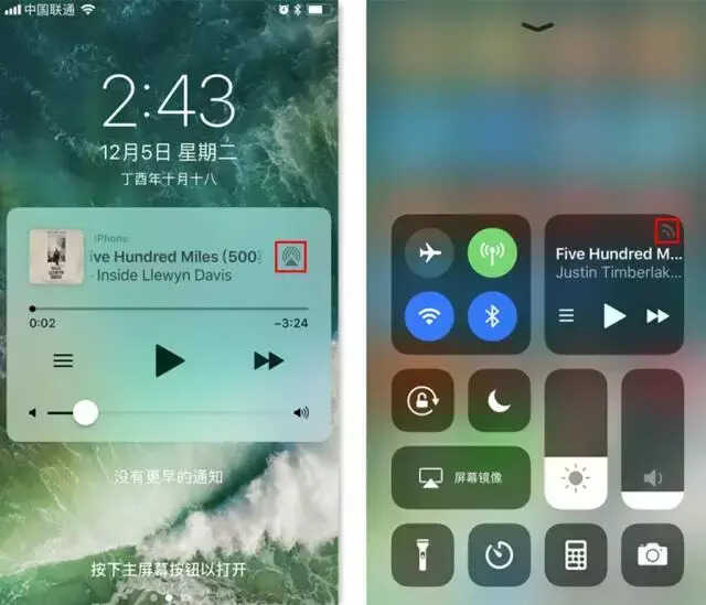 另外一种AirPlay推送方法则和投屏相似,同样拉到控制中心,也可以看到正在播放的音乐,点击右上角的投放按钮(上方右图红框),也可以完成。