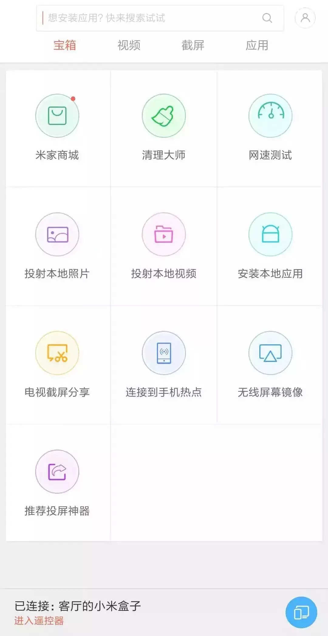第三步,实现投屏。在投屏神器的主界面,我们可以看到上方有“宝箱”、“视频”、“截屏”、“应用”以及搜索,方便您在手机上进行影视内容点播、查看电视上已经安装的应用、搜索安装新的应用等功能。