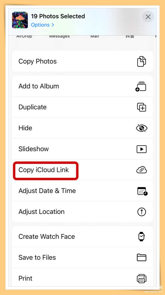 ✅步骤4:你会看到跳出选单,选择“Copy iCloud Link”就会自动生成这些照片的下载连结网址。(如果在找不到Copy iCloud Link选项,请回到 iOS的“Setting”>“Photo”>开启“iCloud Photos”)
