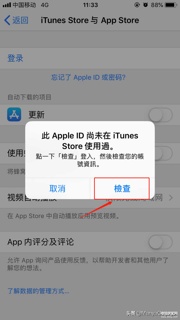 5、 重新点击”登录“,输入注册好的香港地区ID,首次登录,会弹出“此Apple DI尚未在iTunes store/App store使用过”,我们点击”检查“就好了。另外提醒大家,icloud是最私隐的地方,尽量不要用新注册的香港ID登录,”iCloud“和“iTunes store与App store “可以用不同账号登录,所以不用担心。