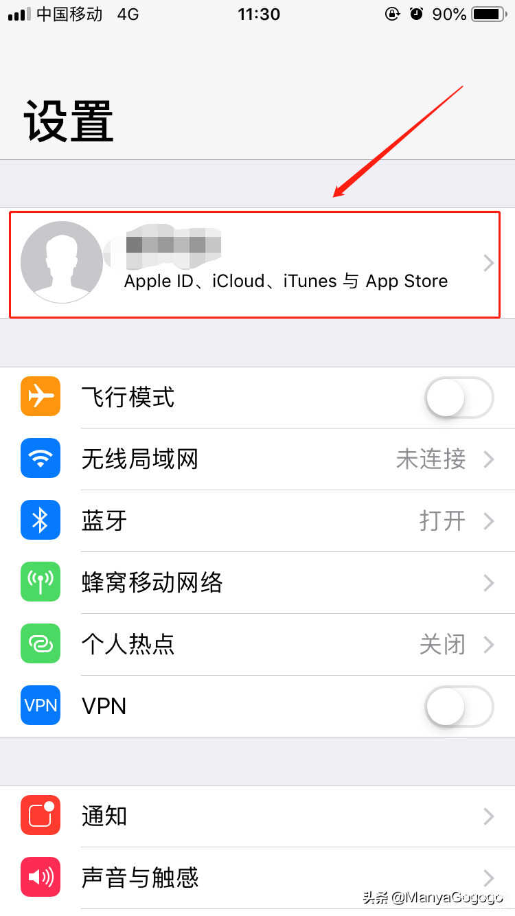 2、 进入“设置”界面后最上面的“Apple ID、iCloud、iTunes与App store”。