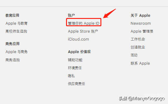 1、 首先,打开苹果官网首页,拉到最底端,在“账户”列表里有个“管理你的Apple ID”,点击进去。