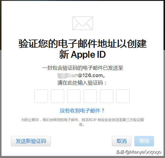 4、 邮箱验证,按照上面步骤后,苹果会发一份验证邮件到你刚填写的邮箱,把验证码填入后点击“继续”。