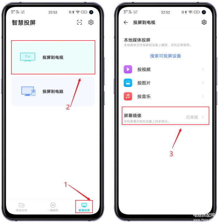 然后点击右下角【智慧投屏】,选择【投屏到电视】,然后点击【屏幕镜像】。