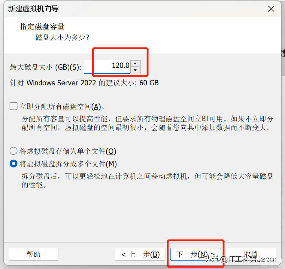 15、指定磁盘容量:这里的话我把最大磁盘大小更改为了120GB,因为我的物理磁盘足够大,如果是物理磁盘不是很大的话,可以保持默认的60GB就行,最后点击下一步