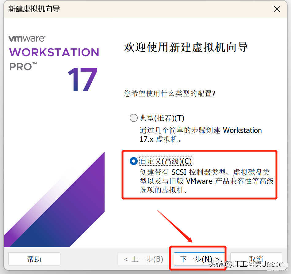 3、欢迎使用新建虚拟机向导:选择“自定义(高级)”,然后点击“下一步”,如果对虚拟机不是很了解的话,可以选择“典型(推荐)”