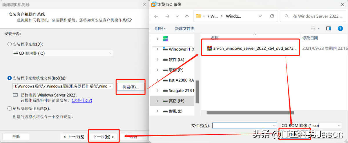 5、点击“浏览”,然后找到下载好的Windows Server2022系统镜像,然后再点击“打开”,最后点击“下一步”