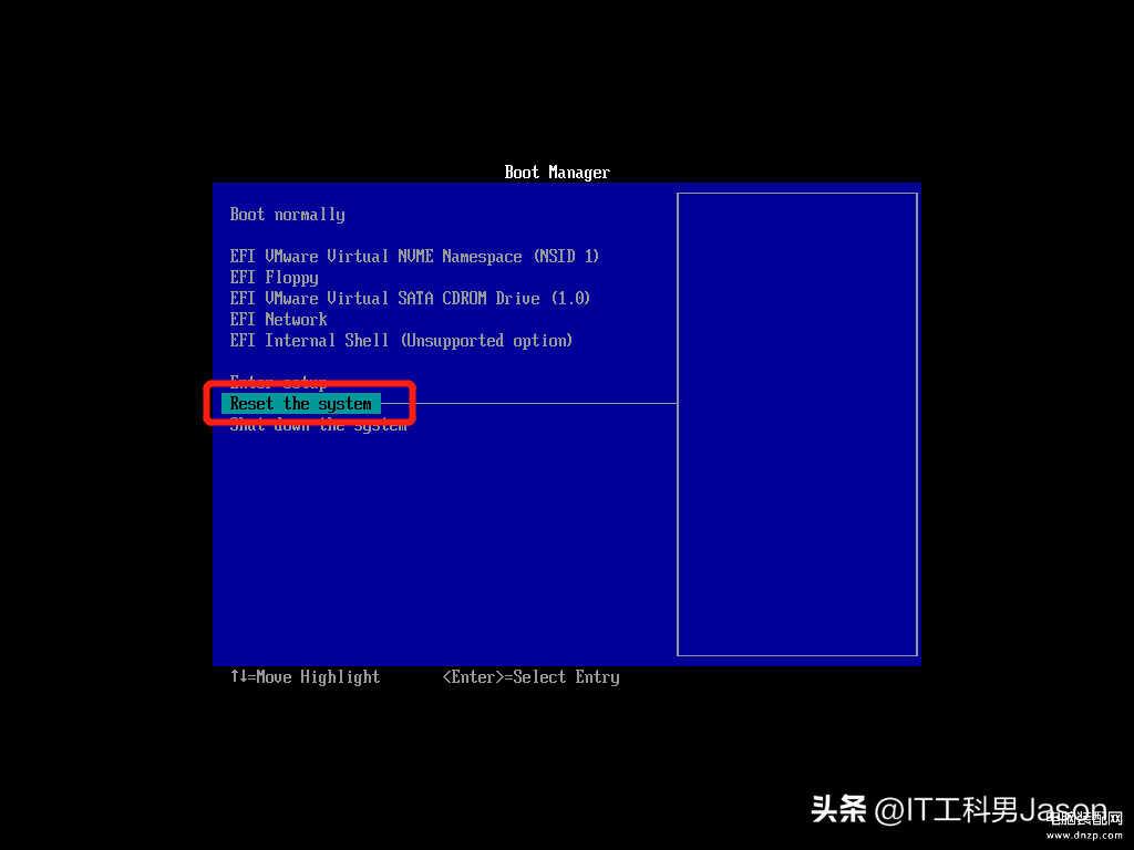 (2)第18部的第(1)小步,如果还是没有按回车键的话,它等一段时间会进入下面的这个界面,在这个界面的时候,我们选择Reset the system的话,然后按回车键,它会回到18步最开始的那个界面,回到那个界面的时候,我们按回车键,它还是会进入系统的安装界面