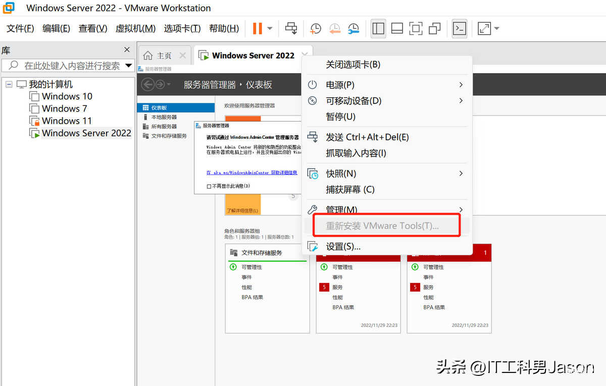 21、进入系统之后,如果没有自动弹出VMware Tools工具的安装界面,就在Windows Server 2022的标题栏上,右键选择安装VMware Tools工具,因为我这里已经安装了该工具,所以我这里显示的是一个重新安装VMware Tools工具的选项
