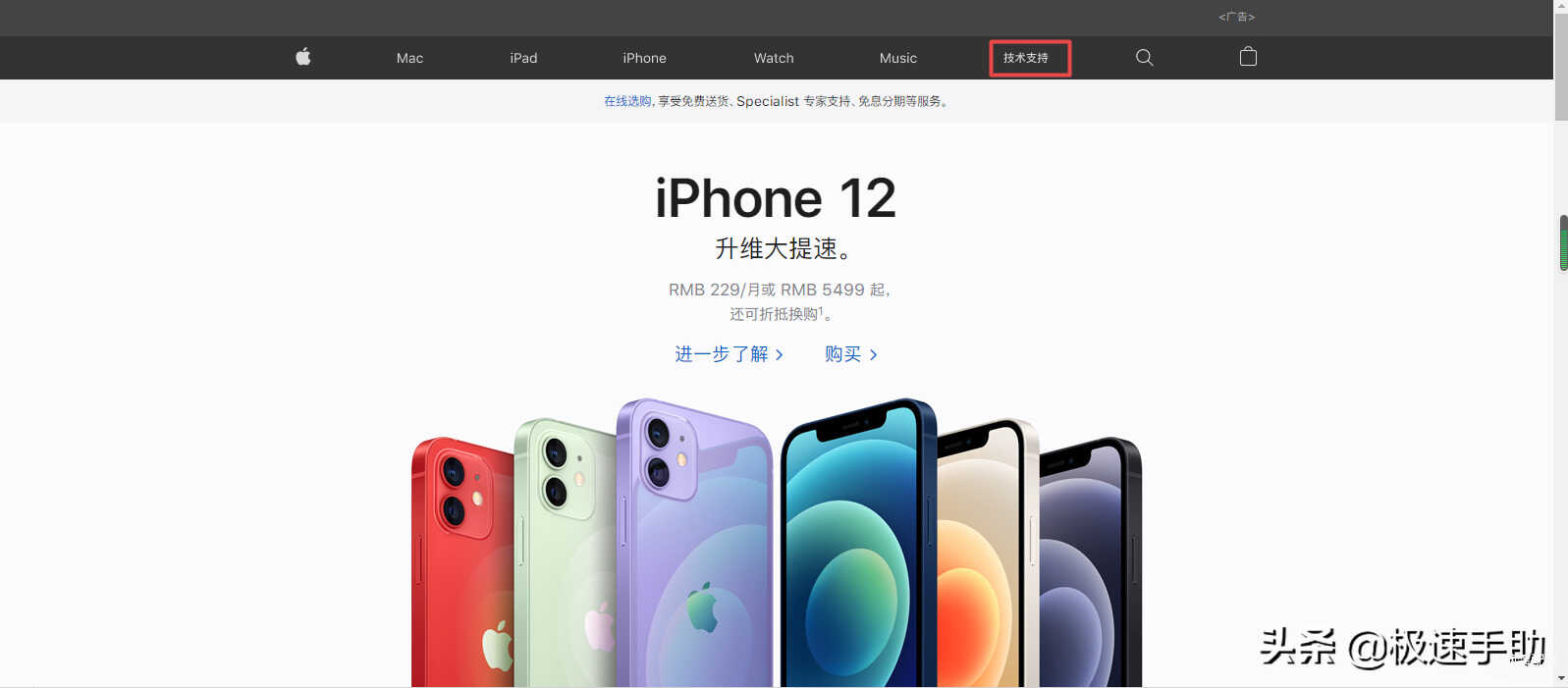 第五步,在电脑的浏览器中打开苹果手机的官网,然后找到【技术支持】,并点击进入。