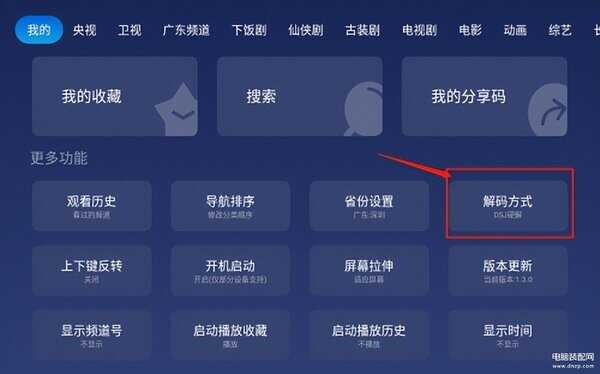 最后,找到【我的】-【解码方式】设置为【DSJ硬解】,可以一键设置所有频道的解码方式,保证老人在看电视的时候不会出现卡顿的情况。