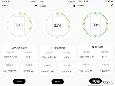 我们对vivo S12进行了三次测试,第一次测试用时5小时12分钟51秒,耗电量61%,第二次测试用时5小时23分钟53秒,耗电量65%,第三次测试用时5小时7分钟18秒,耗电量58%。