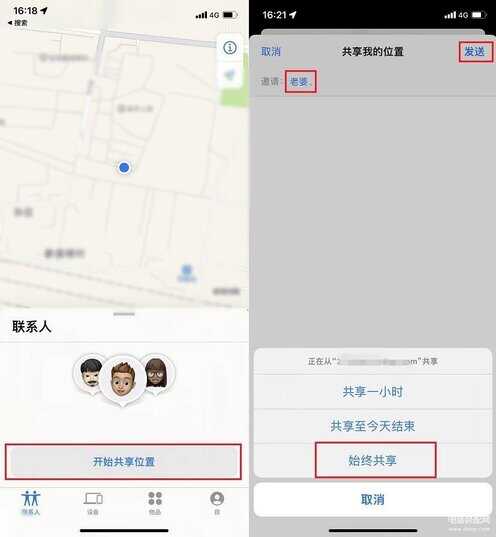 1、首先打开手机自带的的 查找App,点击“开始共享位置”,在邀请后面输入手机通讯录或者Apple ID账号,点击“发送”,选择“始终共享”,如图: