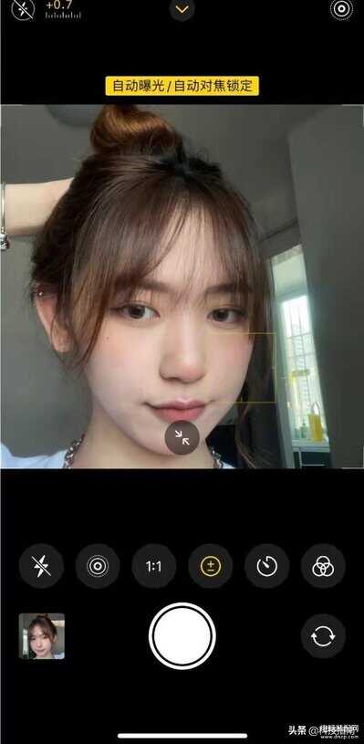 4、自拍的话,就点击人脸长按屏幕,锁定自动对焦把“小太阳”略微往下拉一丢丢,此时不管怎么移动手机,光线都不会改变。