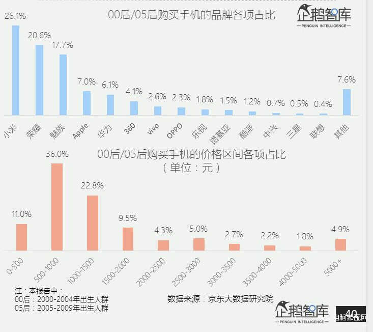 00后和05后所购买的手机品牌中,小米、荣耀的比例均超过2成,魅族排名第三。而00后和05后购买手机的价格大致分布在500元-1500元之间,占比近60%。