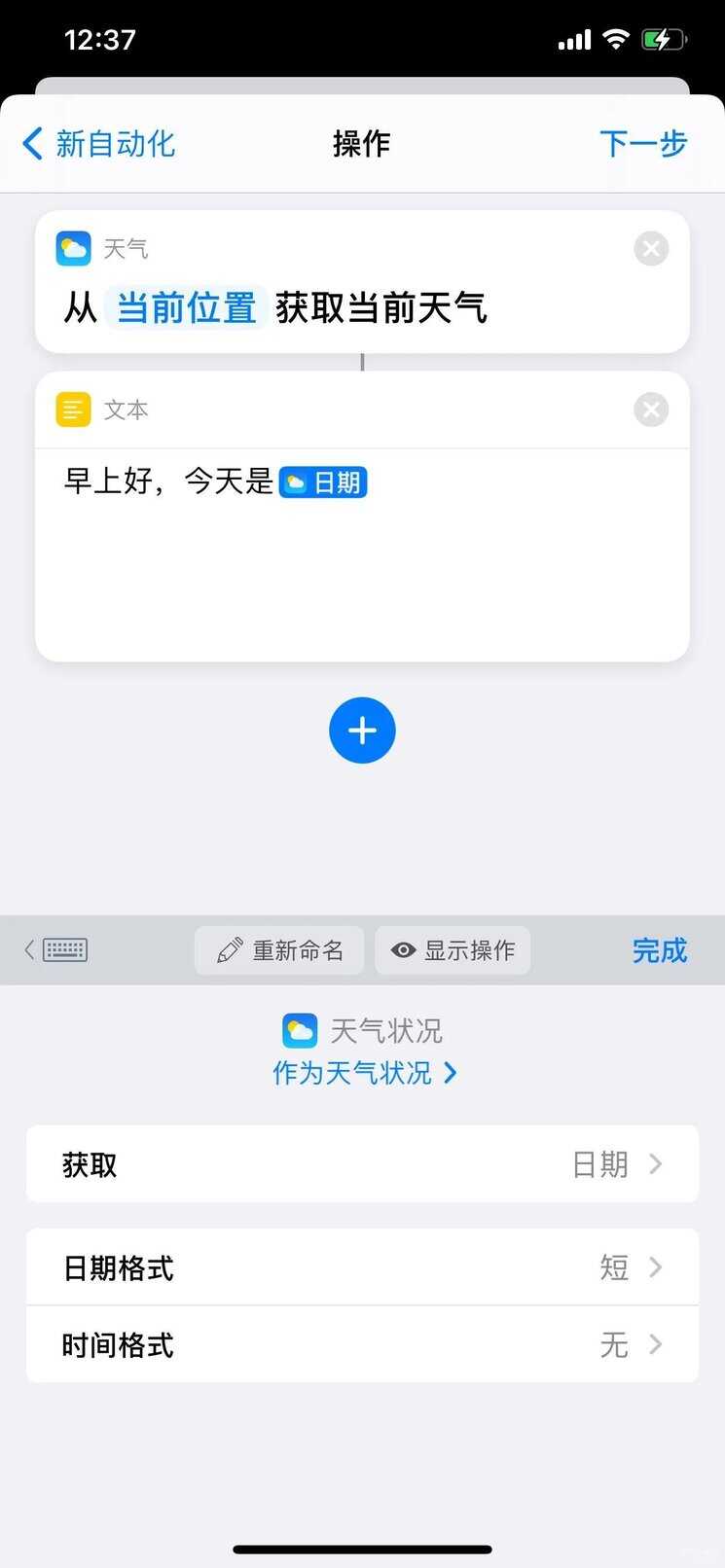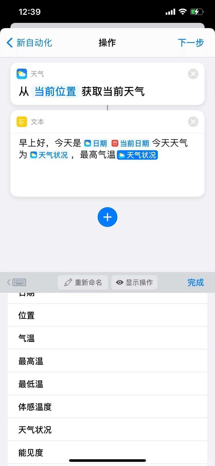 这里都写好后,后面想加什么就自己写就好,其实这里还能添加下雨记得带伞的提示,但是因为比较复杂,所以这个就后面再教大家了,先把这个简单的学会,毕竟快捷指令还有很多好用的功能的, 额,跑题了