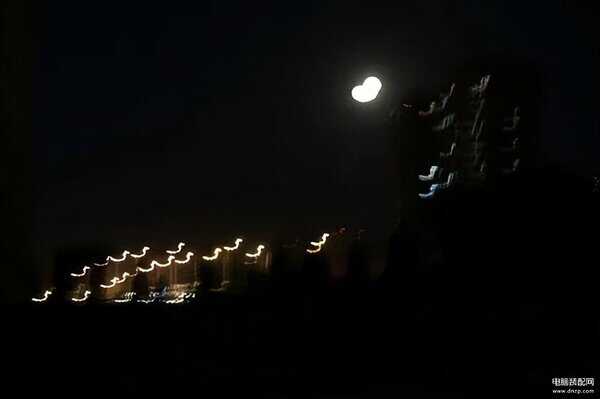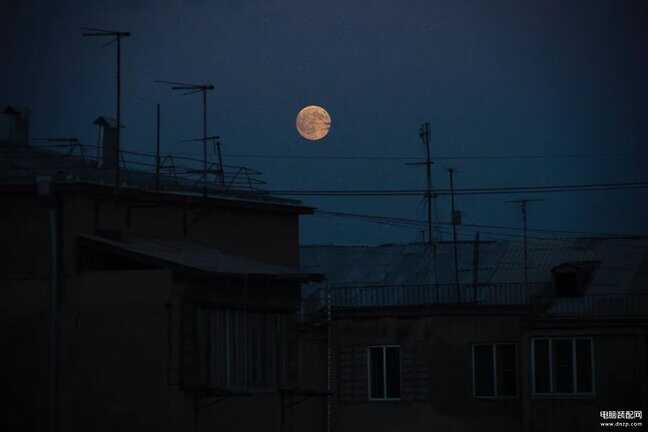 这时月亮的亮度没有太高,光比较小,傍晚天空还残余一些色彩