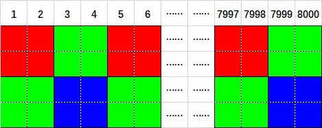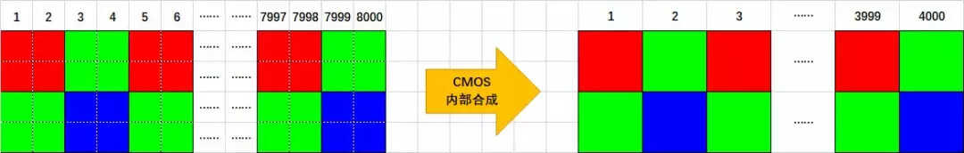 而我们的CMOS传感器就没那么幸运了,起初每个像素只能感应到光线的强弱,而不知道光线是什么颜色,也就是一个黑白传感器。此时一个1200万像素的4:3传感器,横向的像素数比如说是4000个,那么最终拍出的4000x3000照片上的每一个像素直接可以对应到传感器上的每一个像素。