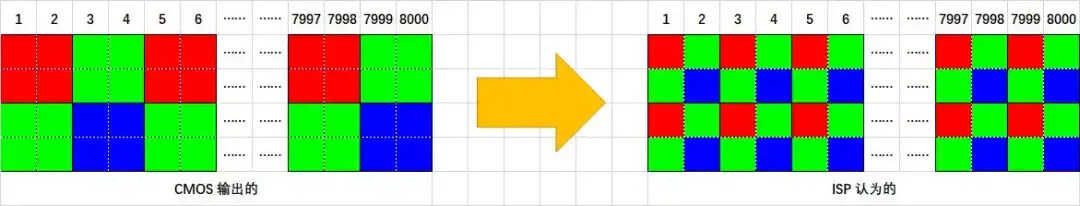 而Quad Bayer优势在于如果光线足够好(此处的足够好一般指的是晴天户外),厂商可以选择让CMOS输出全像素Quad Bayer图像,那么就会遇到一个关键的问题,ISP硬件一般只支持Bayer阵列,并不认识Quad Bayer的排列方式,如果强行让ISP进行Demosaic必然会导致颜色混乱出错。