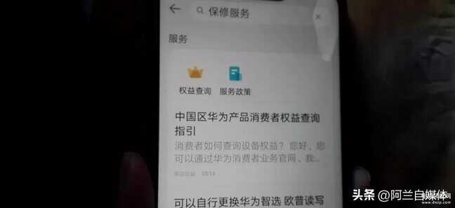 把上方的搜索框点一下输入“保修服务”,注意看下方立刻出现了中华区华为产品消费者权益查询指引,我们把它点开,下方出现了华为消费者业务官网,我们把这个官网打开。