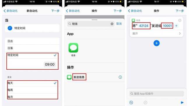 设置:创建个人自动化 ,选择指定时间,搜索短信,选择发送短信,分别填写收信人和短信内容,取消勾选“运行前询问”,最后点击完成。