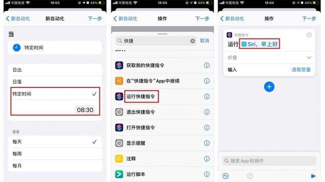 创建自动化:选择添加个人自动化,选择特定时间,搜索快捷指令,选择“运行快捷指令”,最后选择刚才设定的快捷指令,取消勾选“运行前询问”,最后点击完成。