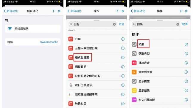 设置:创建个人自动化,选择无线局域网,选择指定的wifi。搜索日期,选择格式化日期,再搜索添加“如果”条件。