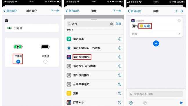 设置:创建个人自动化,选择“充电器已连接”搜索并添加“运行快捷指令”,选择已经添加的“充电”快捷指令即可。而拔电的触发条件则是选择“充电器未连接”,充满的触发条件则是“电池电量等于100”。