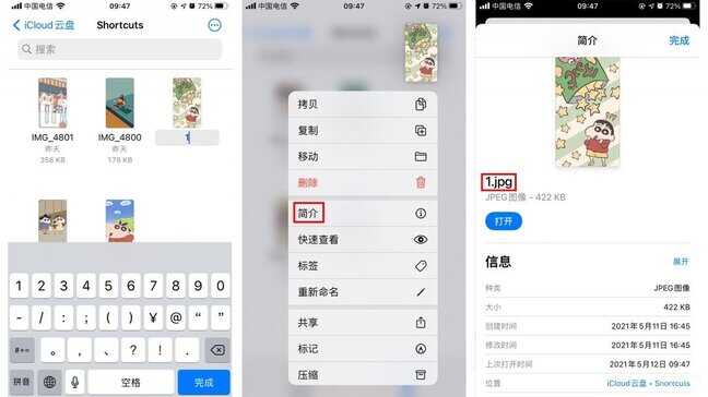 接着确定图片格式和命名。在文件APP中找到iCloud-shortcuts中保存的图片,长按查看详情,记住图片完整的文件名和后缀。(为了方便可以将图片简单命名为1)