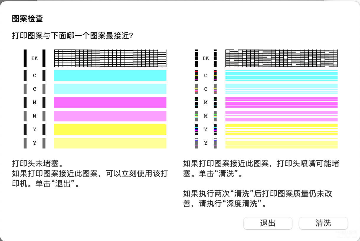 当打印测试打印页时出现右方以下情况时,需要清洗打印头,排除故障。