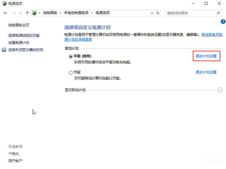 3、在首选计划栏点击“更改计划设置”,如下图所示: