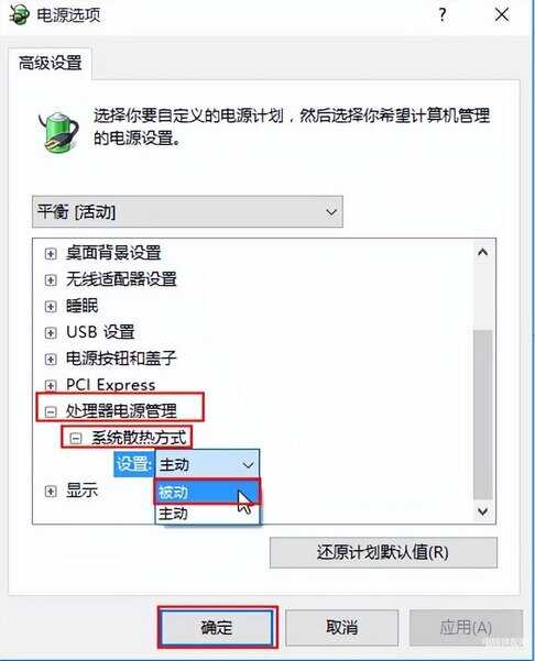 5、依次展开“处理器电源管理-系统散热方式-设置被动”,点击确定,如下图所示: