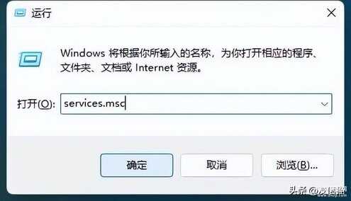 在打开的运行程序中输入:services.msc,点击确定。