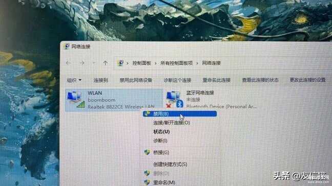 打开控制面板的网络连接,查看WLAN功能是否禁用,右击WLAN图标即可启用。