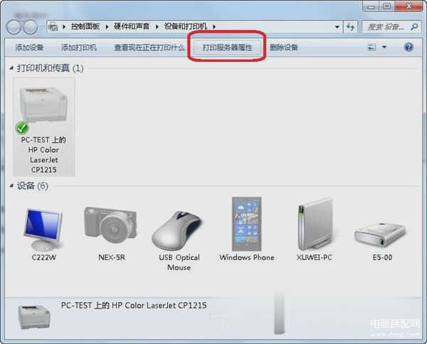 1.开始-设备和打印机:随便选择一个打印机图标,选择打印机服务器属性;