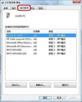 2.单击打印服务器属性--驱动程序--删除,选择删除驱动程序和驱动程序包,点确定;