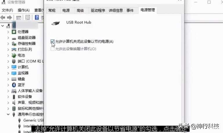 右击开始菜单,选择设备管理器,展开通用串行总线控制器,右击USB Root Hub,选择属性,在电源管理的标签下,去除允许计算机关闭此设备以节省电源的勾选。
