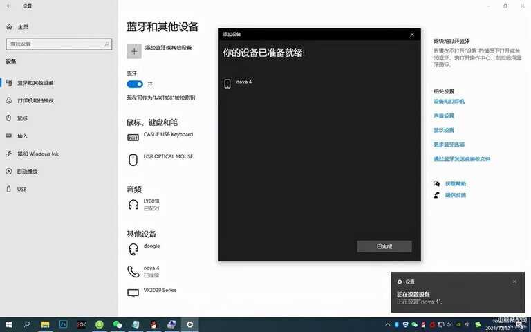 4、华为手机与台式电脑蓝牙配对成功。这里需要注意的是,第一次蓝牙配对成功后,后续会自动记忆匹配,不需要反复添加蓝牙设备。