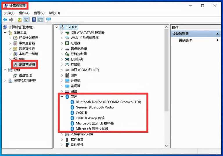 注意:如果【设备管理器】中有【蓝牙】选项,则说明你的电脑支持蓝牙功能,如果没有的话就说明电脑不支持蓝牙功能。这种情况下,想要实现台式电脑连接蓝牙设备,需要搭配一个USB蓝牙适配器。