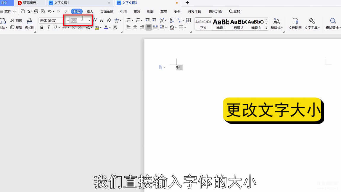 步骤②选中文字,在上方字体后面直接输入字体大小,调整至需要大小即可。