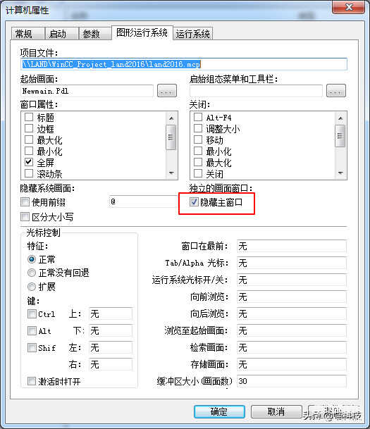 4、由于主画面上仅仅设置了两个画面窗口,没有其它显示,因此需要在图形运行系统中,勾选“隐藏主窗口”选项。