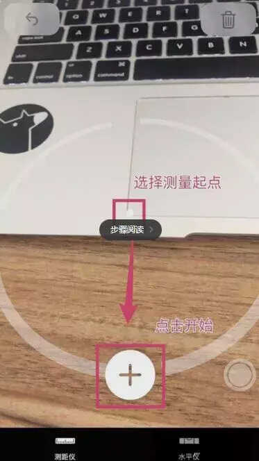3、界面中会出现一个圆圈,中间有一个小圆点,将这个点对准你想要测量距离的物体的一端,然后点击【+】添加图标,这个点将作为测量的起点。