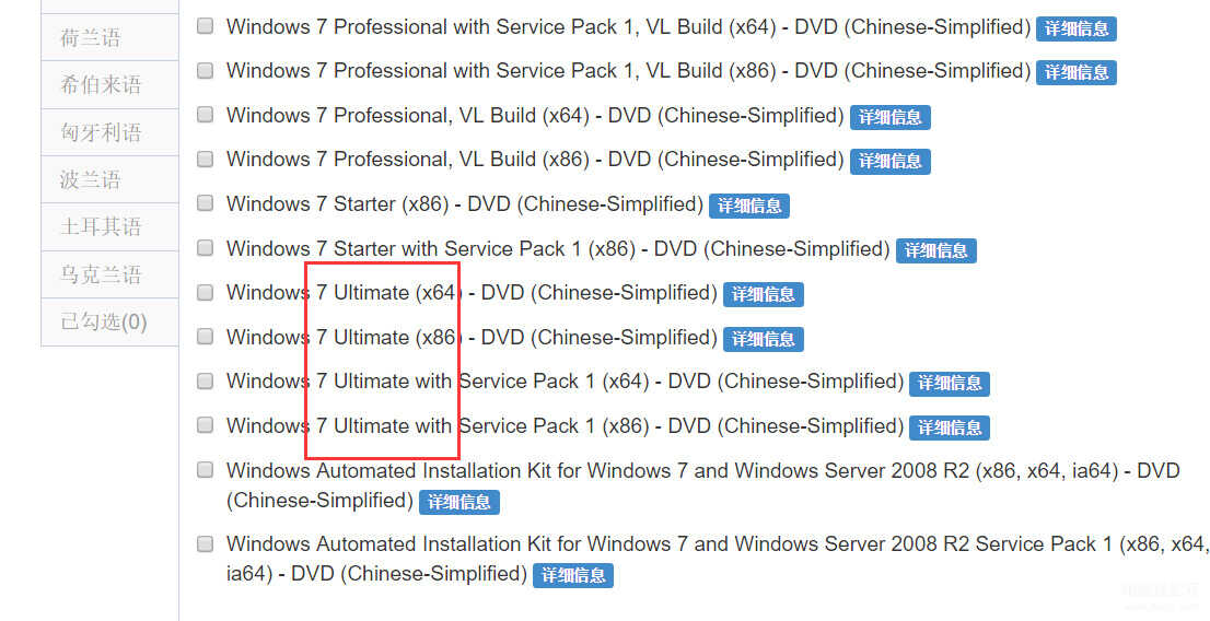 选择好语言以后,鼠标下拉在里面找打:windows 7 Ultimate(win7旗舰版),点击详细信息。