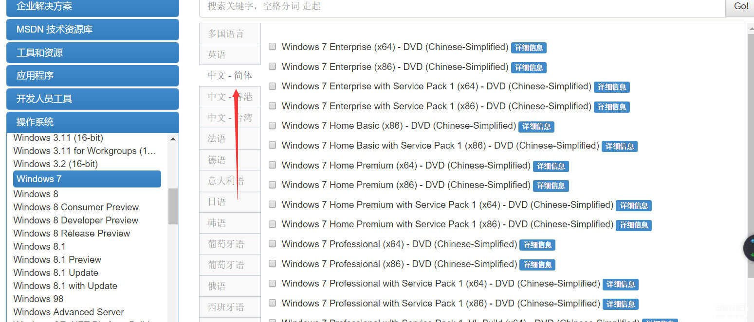 点击展开后,在右侧就可以看到windows 7 ,在里面选择语言版本:中文简体。