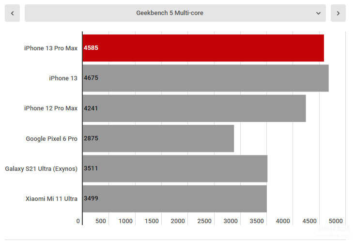 就核心性能而言,iPhone 13 Pro Max 及其 A15 Bionic 简直是独孤求败,即使与高端安卓旗舰手机相比也是如此,在我们的一些基准测试结果中,iPhone 13 Pro Max 远远领先于竞争对手,下图通过 Geekbench 5 测试的结果可以看出: