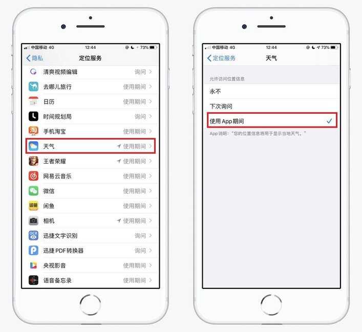 定位开启后,下方将会显示出所有应用名称,只需要找到【天气】,并勾选【使用APP期间】。