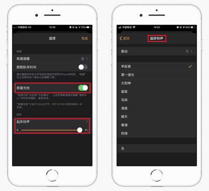 在选项界面,开启【就寝勿扰】,这样通知栏中的所有通知,都会被隐藏;接着再设置起床铃声以及震动模式,也可以调节音量大小。