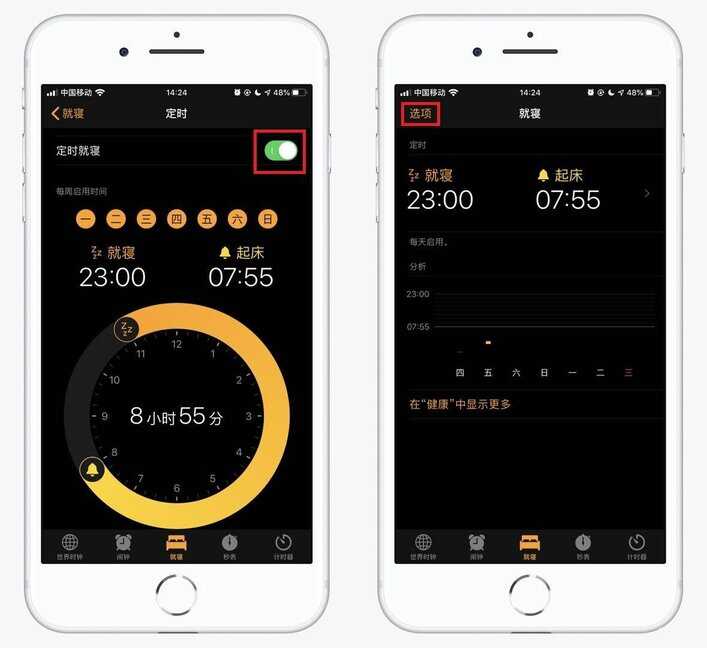 1.使用就寝功能,睡眠时间一到,手机就会响起柔和的音乐,提醒你准备睡觉;起床时间一到,手机也会响起柔和的音乐,把你从睡眠中唤醒。